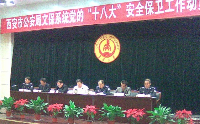 10月24日下午,西安市公安局文保系统“十八大”安全保卫工作动员部署会议在长安大学召开。省公安厅、省教育厅、市公安局有关领导出席会议并作重要讲话,文保系统全体成员单位参加了会议,西北工业大学、省广电局代表文保系统全体成员单位作了表态发言。